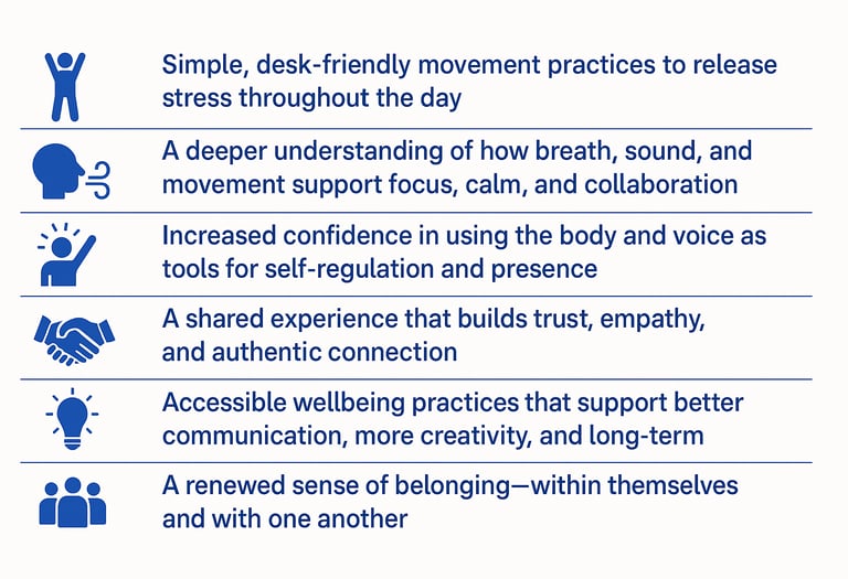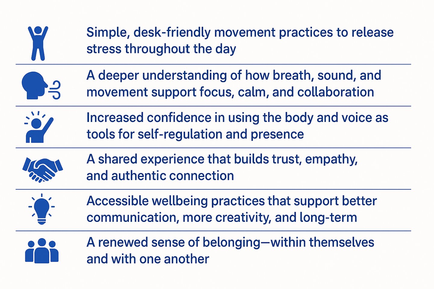 This signature portion of the session introduces participants to vocal toning—a meditative practice using sustained vowel sounds and gentle humming. No singing experience is needed. We’ll tone together to explore resonance, restore self-expression, and cultivate shared harmony. This portion is especially impactful for communication-heavy roles or teams navigating change, collaboration, or burnout.