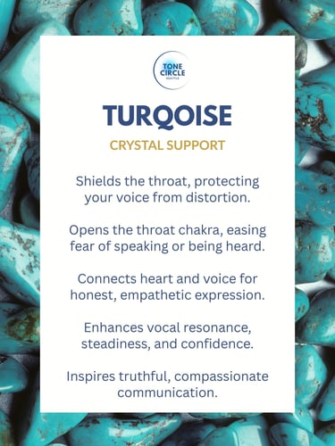 Vocal toning is rooted in the understanding that sound and energy are inseparable. Every vibration we create ripples outward, resonating through our bodies and the space we share. We encapsulate those good vibes by using them to infuse or "charge" small crystals. Each semi-precious stone is chosen specifically for its supportive properties for the voice and throat chakra alignment. At the close of each session, every participant is invited to choose a charged crystal to take with them as a token of their practice, ready to assist them in their unique vibrational journey.